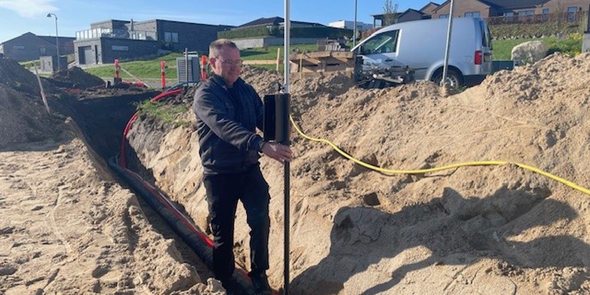 Grenaa Varmeværks ledningsmester, Carsten Ramussen, sikrer sig korrekt indmåling af vores fjernvarmerør med GPS-opmåling, og derved får Grenaa Va...